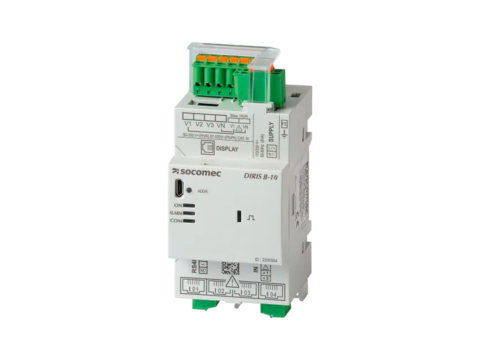 DIRIS B er en strømovervågningsenhed, der kommunikerer via RS485. Enhedens 4 uafhængige RJ12-strømindgange gør det muligt at styre flere typer og antal kredsløb: for eksempel 4 x enfasede belastninger eller 1 x trefaset belastning + 1 x enfaset belastning.