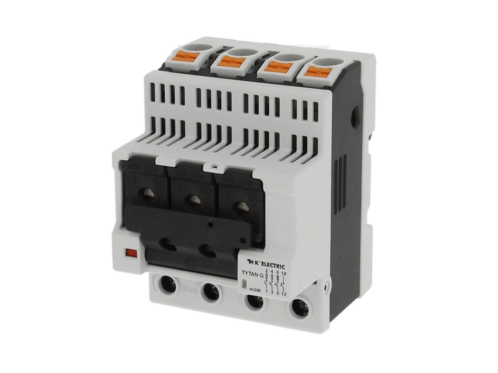 TYTAN® Q gruppeafbryder med hjælpekontakt fra K’ELECTRIC i 3-pol. Gruppeafbryderen kan monteres med D0 sikringer.