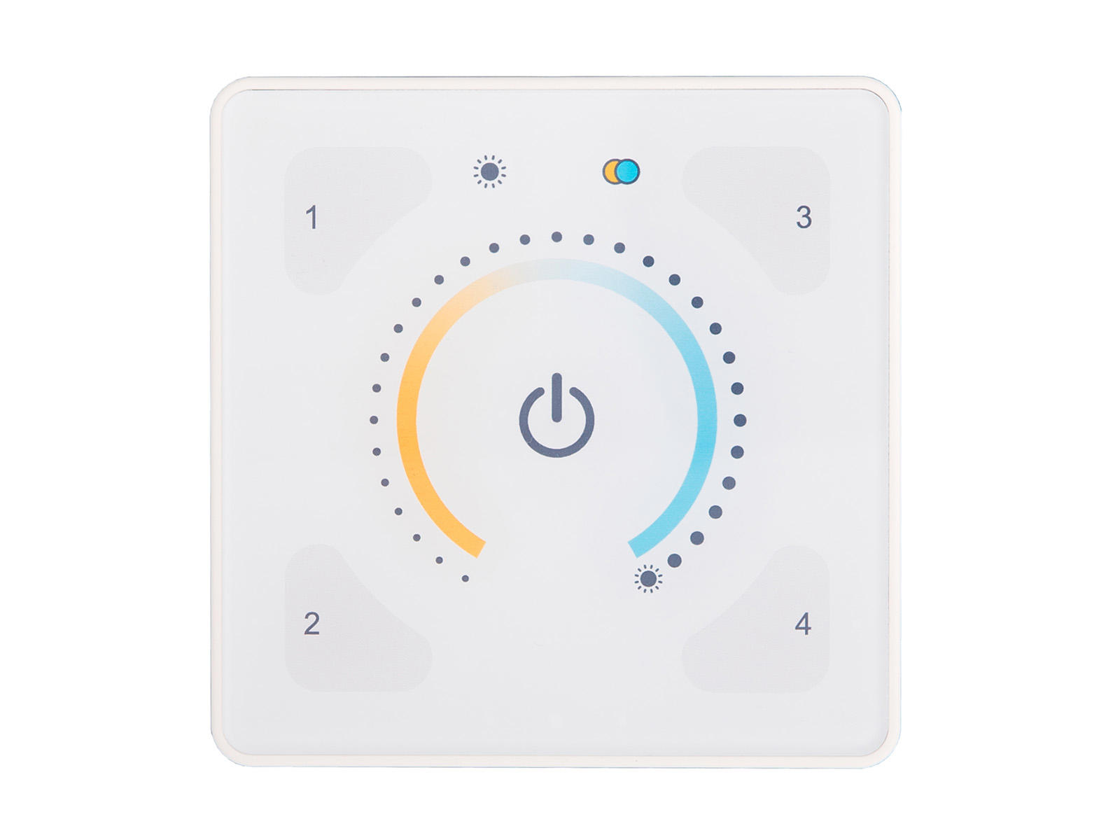 ILLUSTRIS® Colour Temperature Control panel i glas med fire scener, sluk/sidste niveau og styring af intensitet og farvetemperatur.