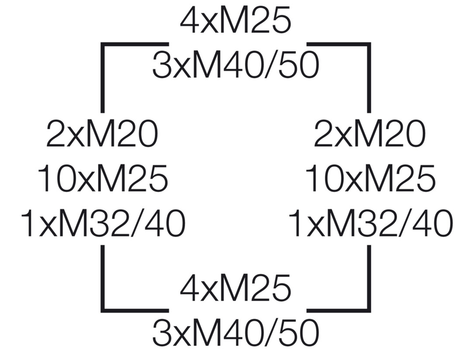 Klemmer til udgående kabler: 4-35 mm², Cu, runde ledere til PE- og N-klemme: 1 x 4-35 mm², Cu, runde ledere