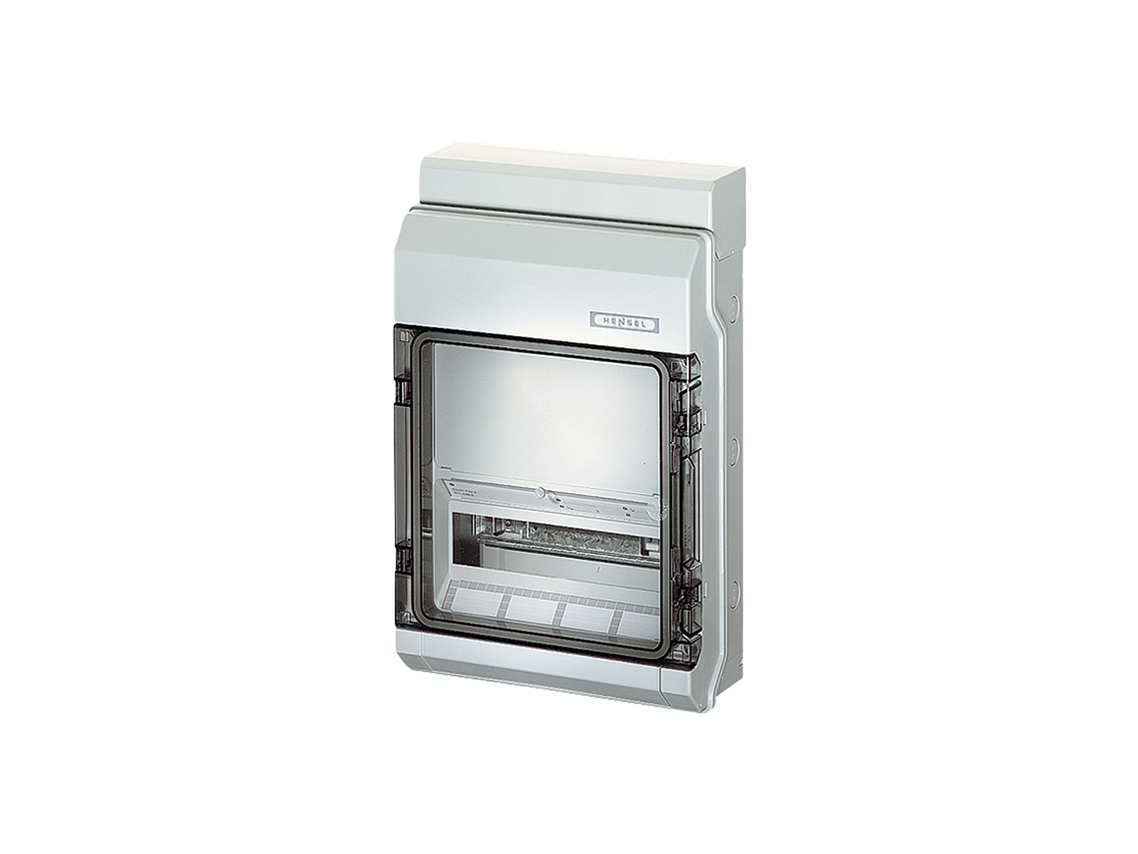 Kasse med DIN-skinne med ekstra plads til elektrisk udstyr, som ikke skal aktiveres manuelt. Kabelindføring via integrerede gummimembraner.