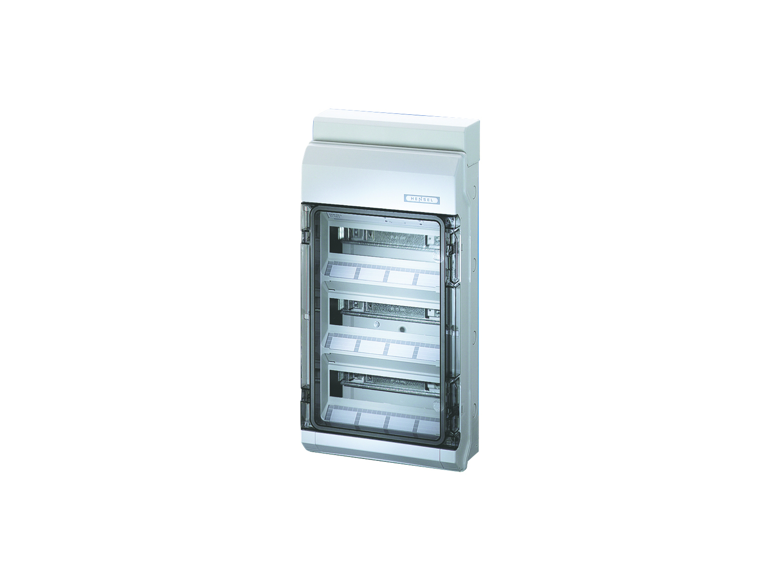 Kasse med DIN-skinne og kabelindføring via integrerede gummimembraner.