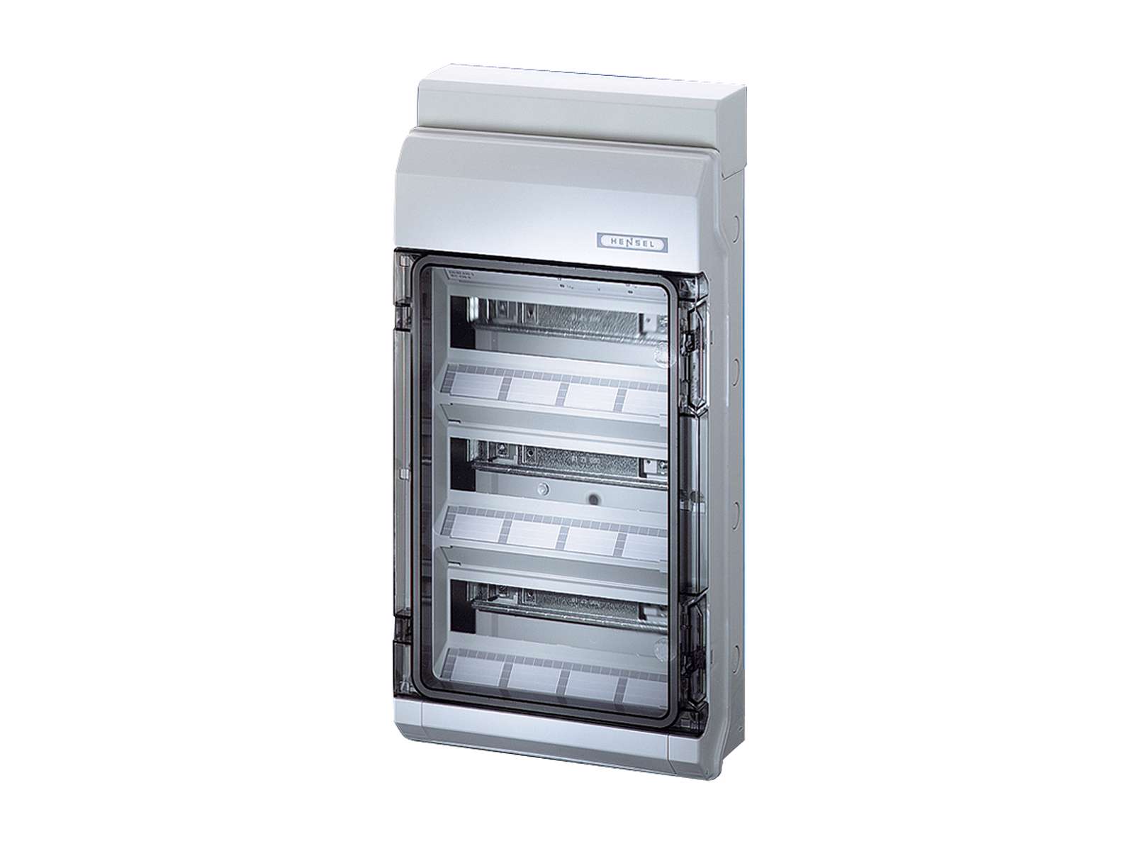 Kasse med DIN-skinne og kabelindføring via integrerede gummimembraner.