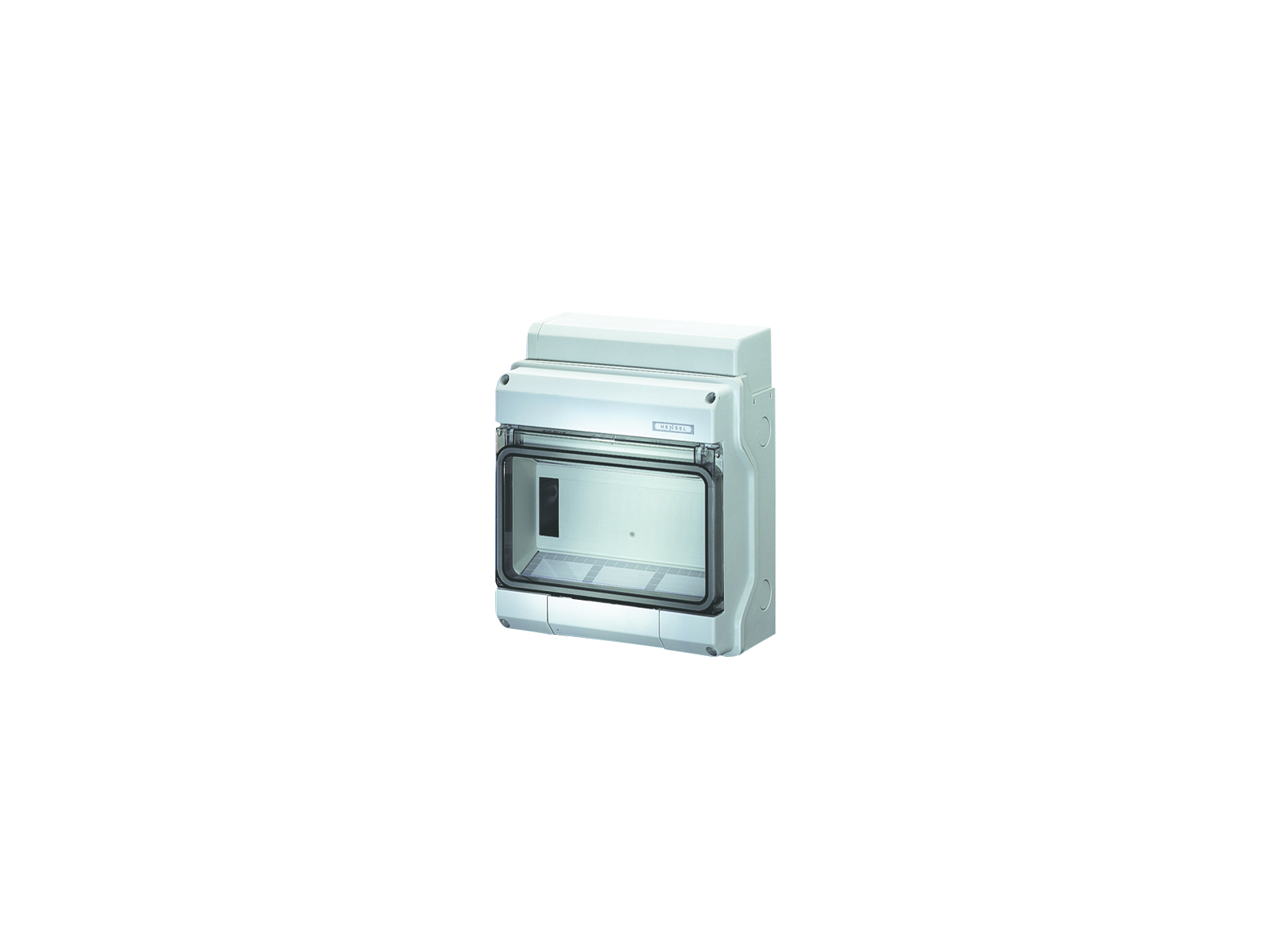 Kasse med DIN-skinne og kabelindføring via integrerede gummimembraner.