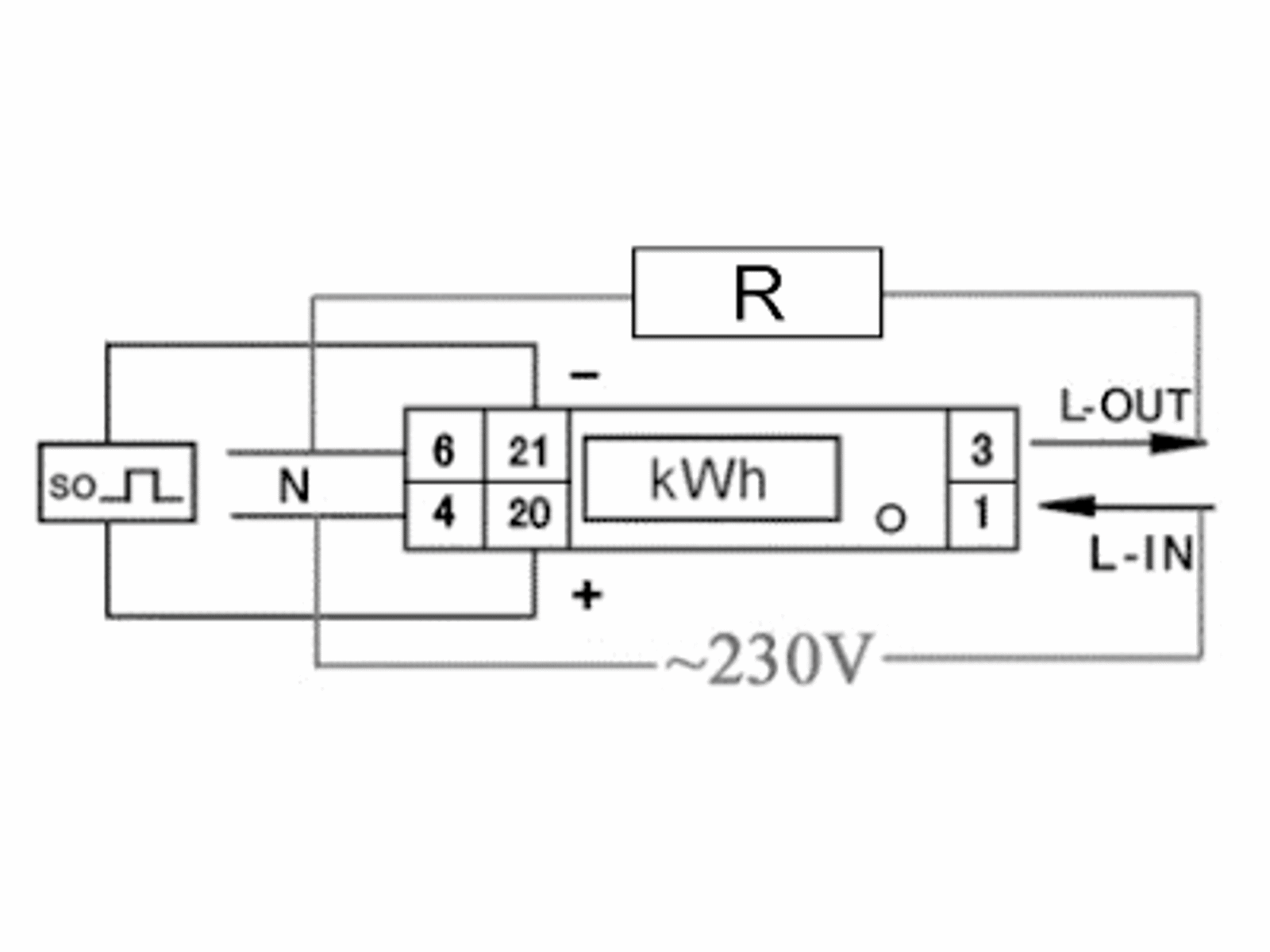 Funktion:Energiforbrug er indikeret med en blinkende LED. Antallet af pulser er konverteret til energiinput, og værdien vises i LCD displayet. Cifrene vises i hundrededele (.01 kWh = 10Wh).