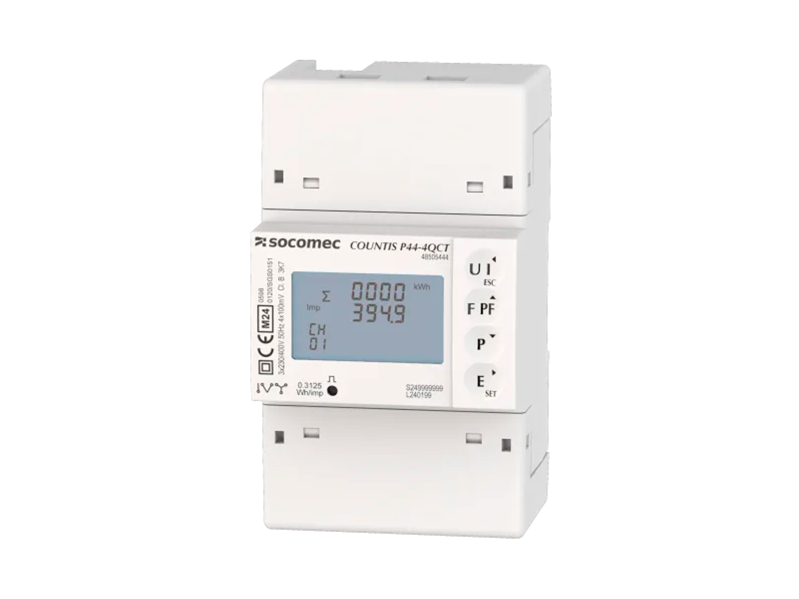 Socomec COUNTIS P44-2QCT kWh måler, som tilsluttes 2 QCT-C-xx via RJ12, Modbus. Elmåleren er MID-certificeret.
