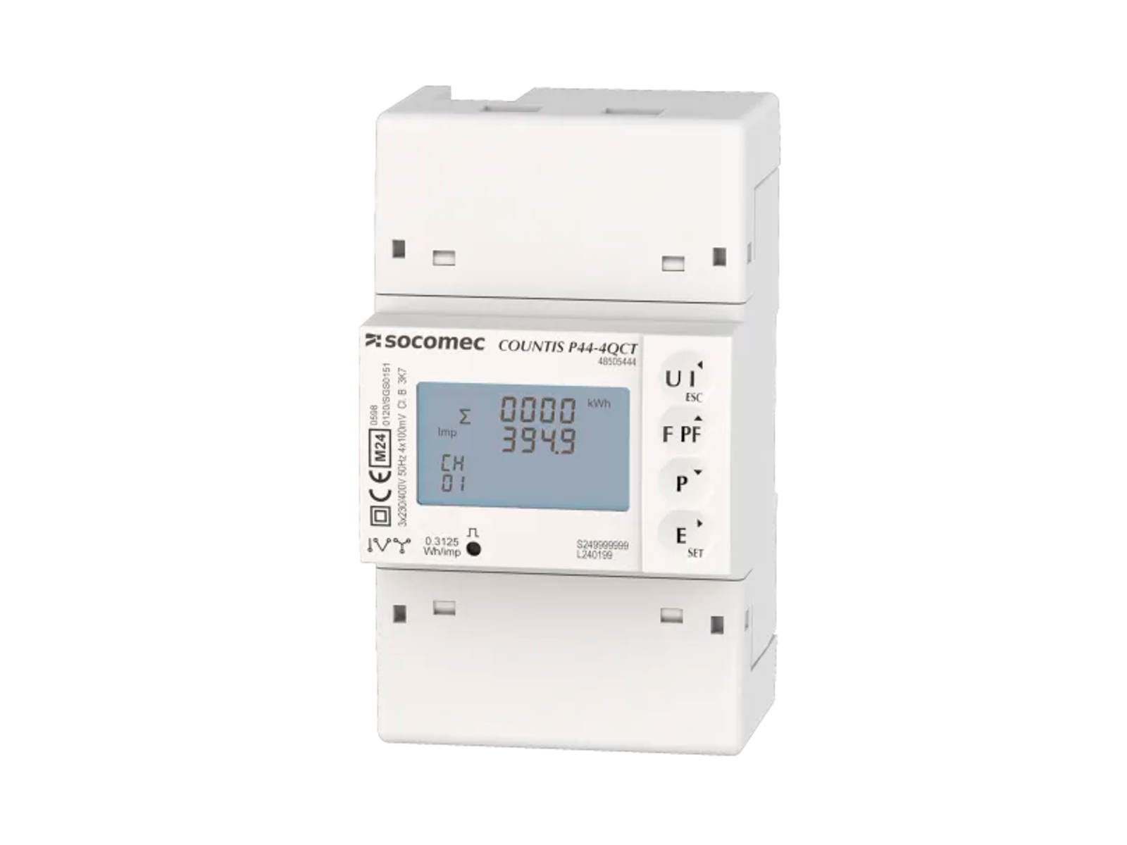 Socomec COUNTIS P44-4QCT kWh måler, som tilsluttes 4 QCT-C-xx via RJ12, Modbus. Elmåleren er MID-certificeret.