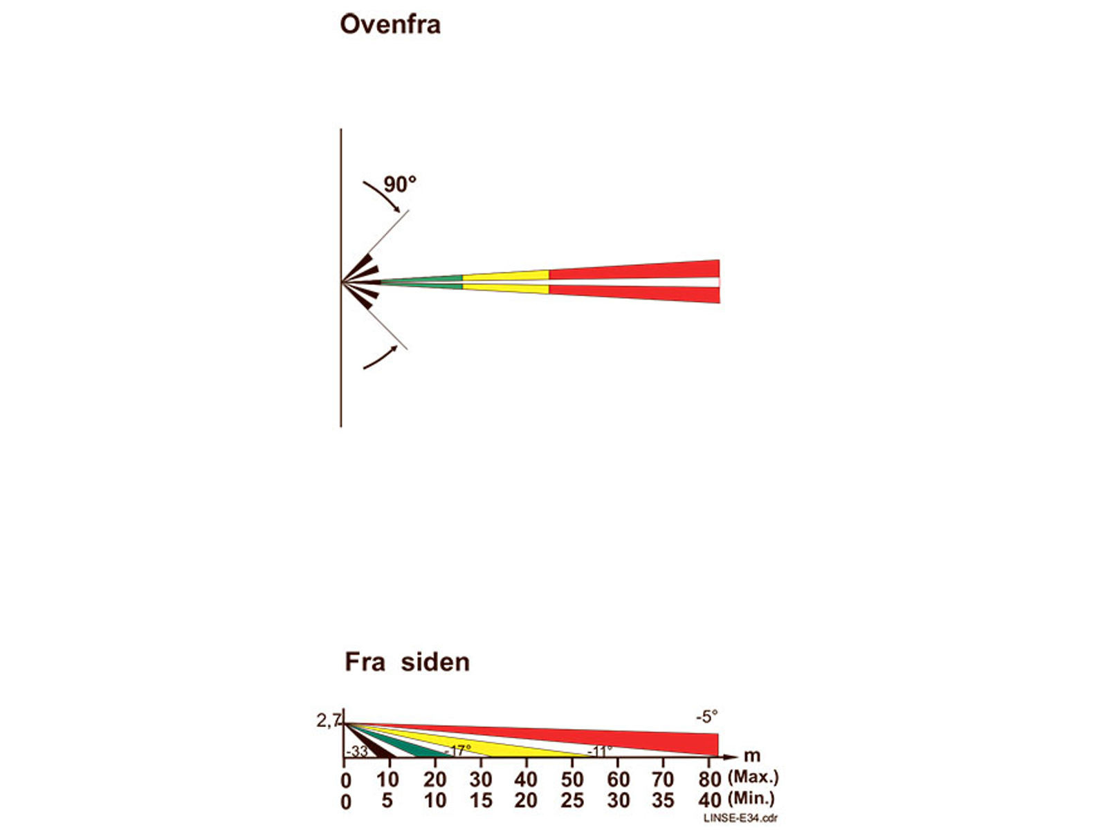 Linse 34 ser i en 8º vinkel 83 meter lige frem i fire detekteringslag, herudover ser den i en 90º vinkel 10 meter frem i et detekteringslag.