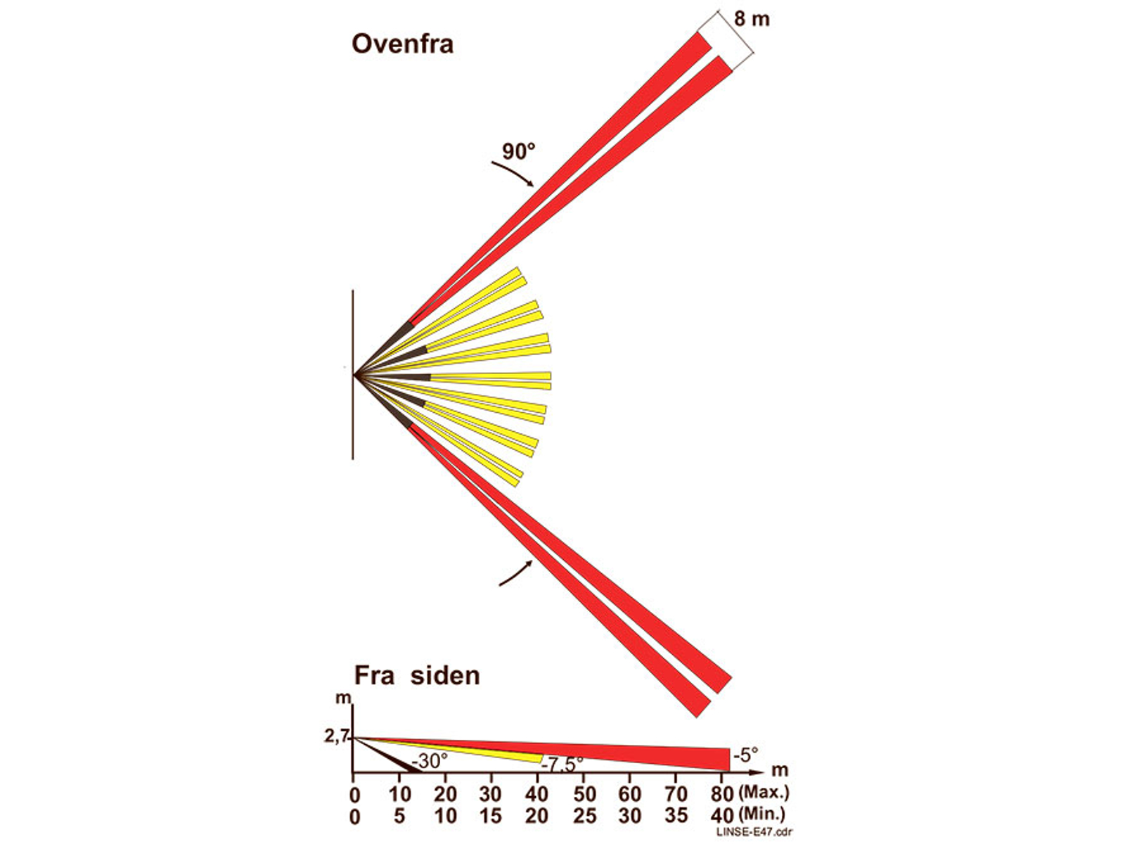 Linse 47 ser 2 stk. 8º vinkler med 90° forskydning 83 meter frem i tre detekteringslag, herudover ser den i en 90° vinkel 40 meter frem mellem disse.