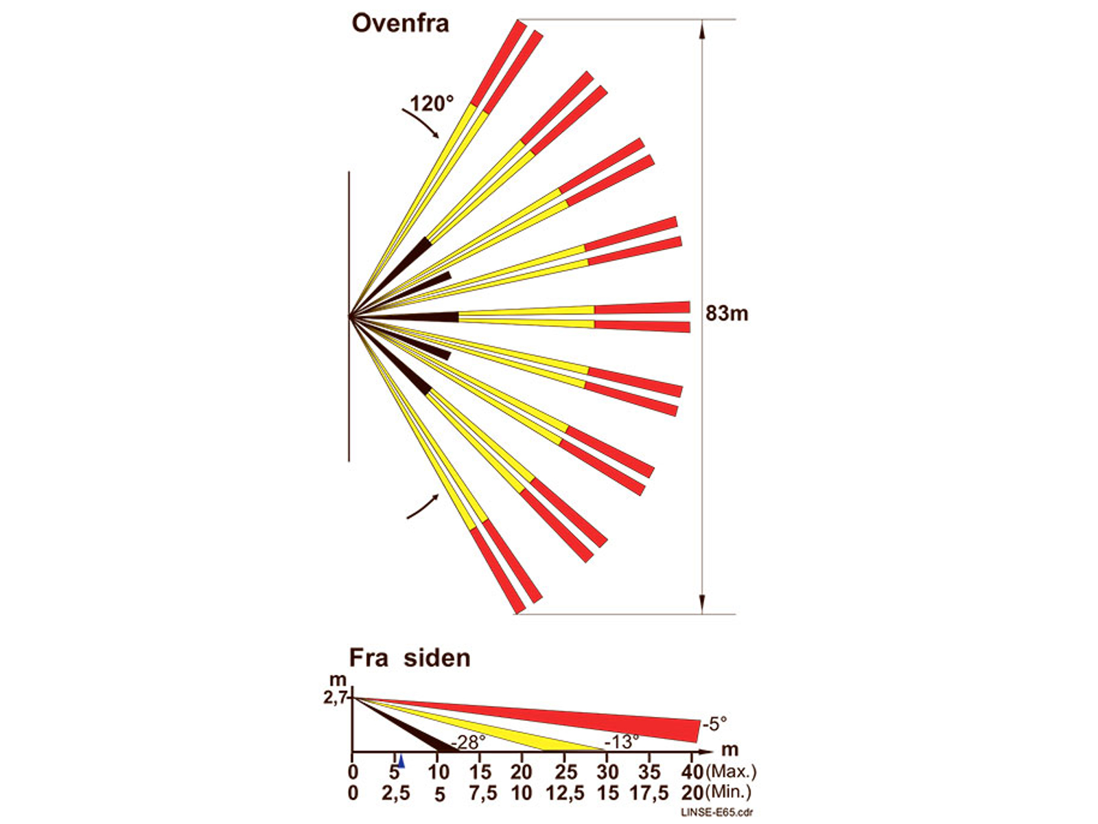 Linse 65 ser i en 120º vinkel 41 meter frem i 3 detekteringslag. Den kan afdække et område på max 41 x 83 m.