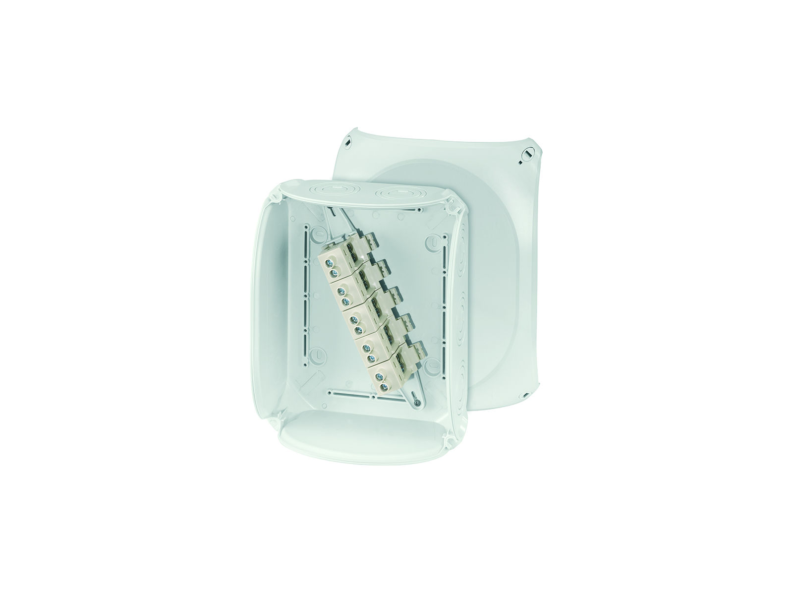 Hensel forgreningsdåse med klemme til Cu-leder, 2 terminaler per pol. Kabelindgang via udslagsblanketter.