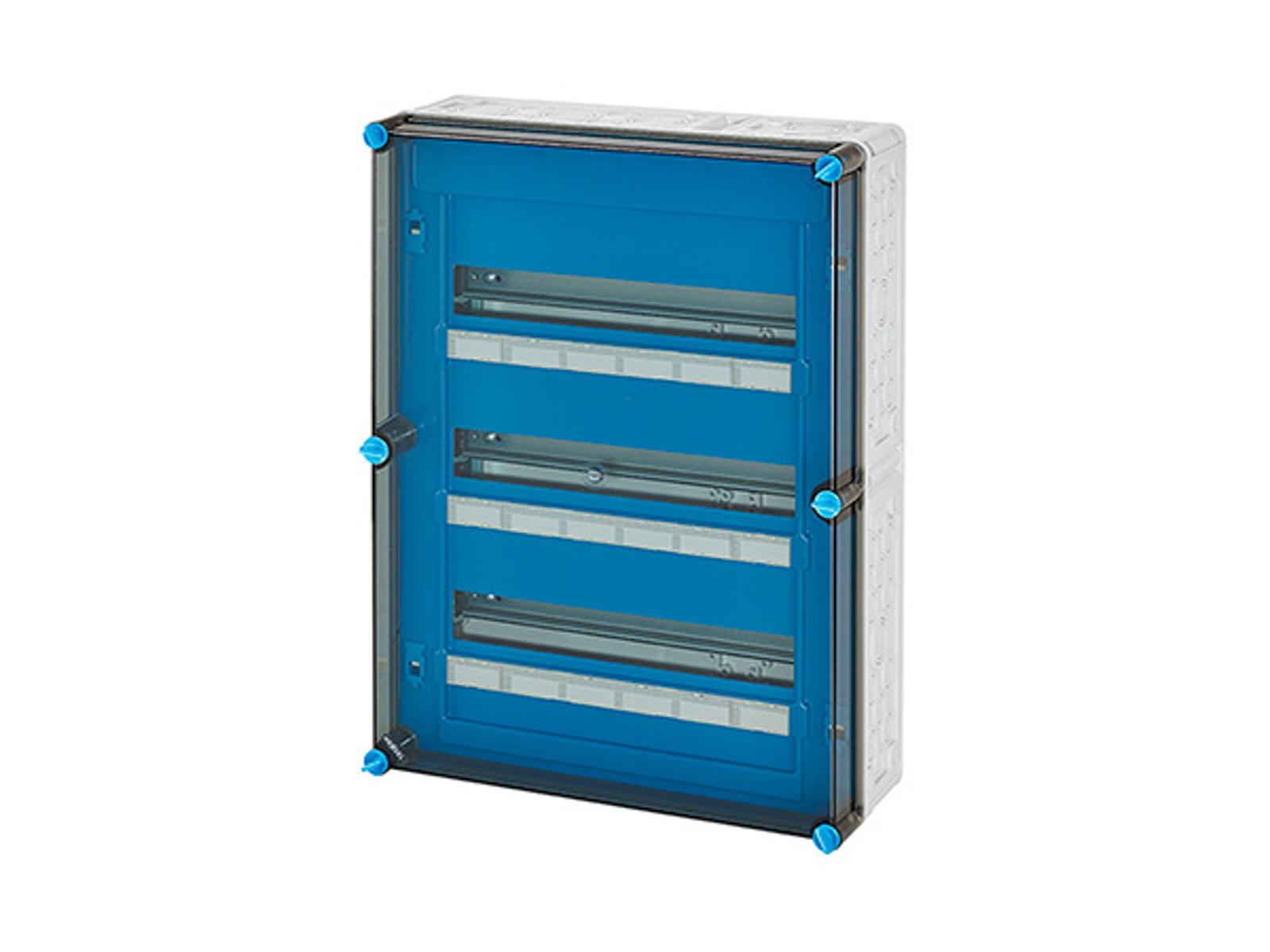 Kasse med DIN-skinne - 54 moduler (3 rækker x 18 moduler). Med skrueklemmer til PE/N til kobberleder.
