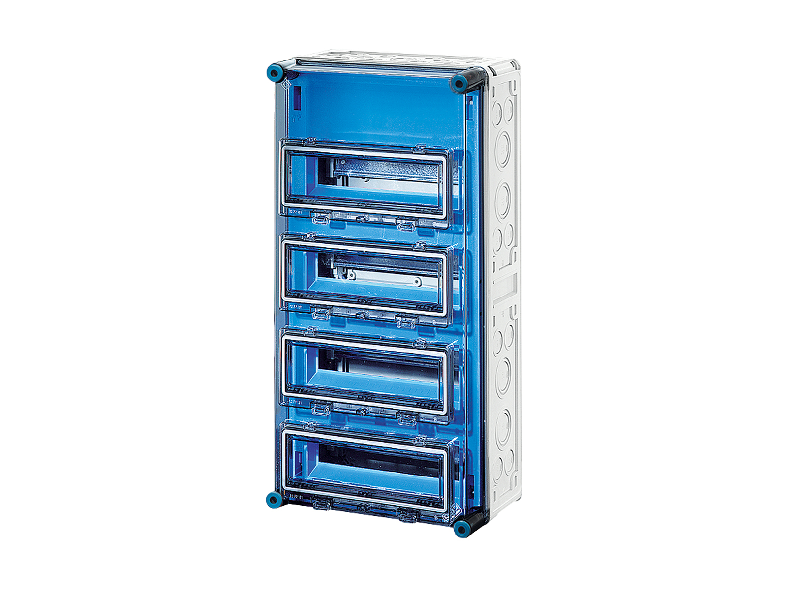Kasse med DIN-skinne - 48 moduler (4 rækker x 12 moduler per række) med 4 stk. hængslede klaplåger. Med FIXCONNECT® plug-in klemmeteknologi for PE og N.