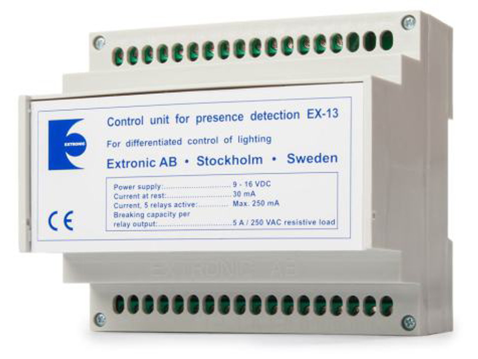 EX13 kan også programmeres til styring af 2 separate lokaler med hver sin tilstedeværelsesdetektor. I hvert rum kan 2 lysniveauer styres. Når tilstedeværelsen ophører, slukkes belysningen automatisk efter en indstillet tidsforsinkelse (indstilles i detektoren). Belysningen kan også slukkes manuelt.