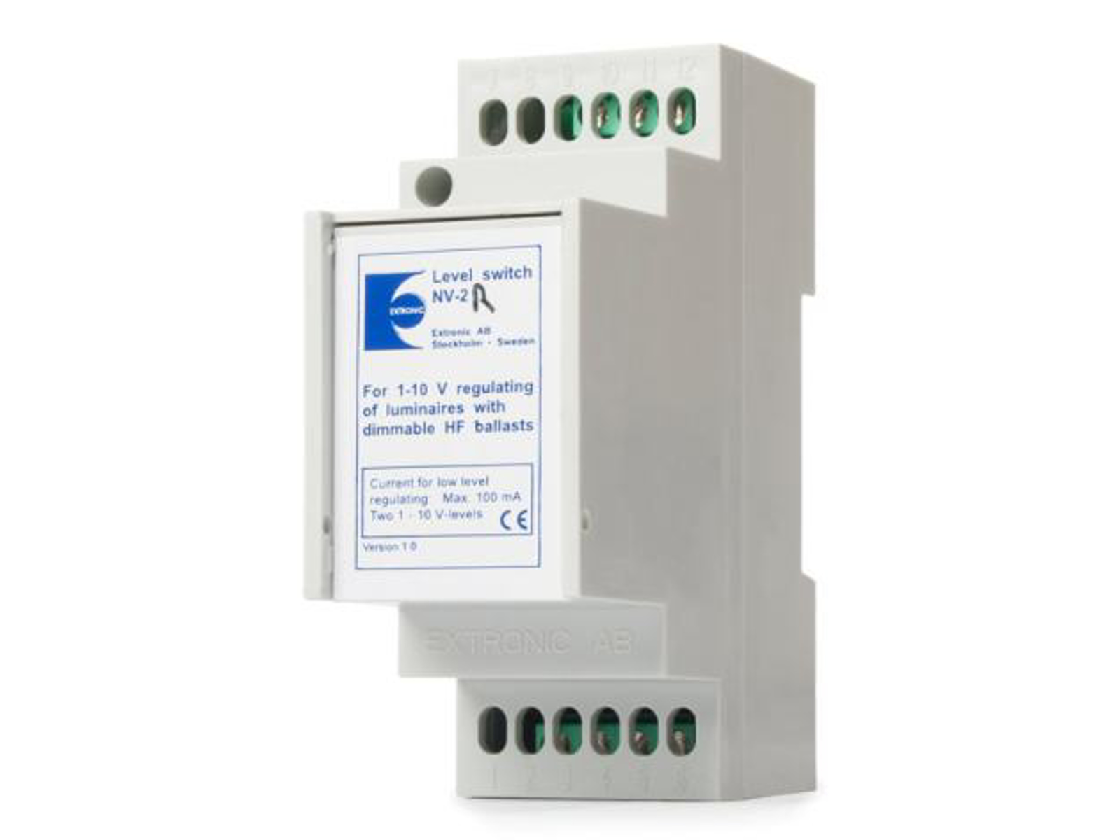 NV2R har to elektronisk stabiliserede potentiometre, som er tilpasset lavniveaustyring 1-10V af HF-forkoblinger. Niveauvælgeren er beregnet til montering på DIN-skinne i eltavlen.