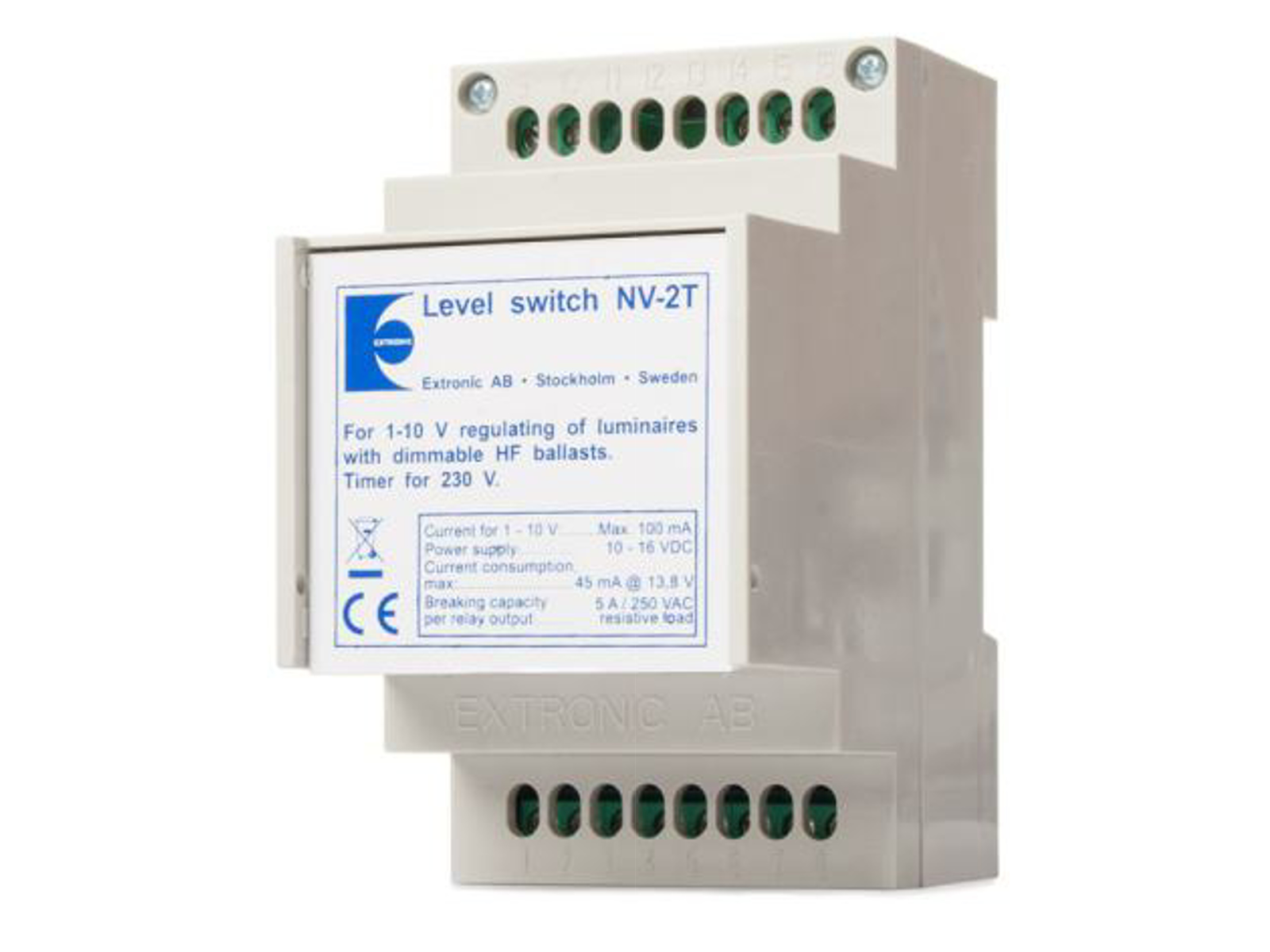 NV2T har to elektronisk stabiliserede potentiometre, som er tilpasset lavniveaustyring 1-10V af HF-forkoblinger. Niveauvælgeren er beregnet til montering på DIN-skinne i eltavlen.