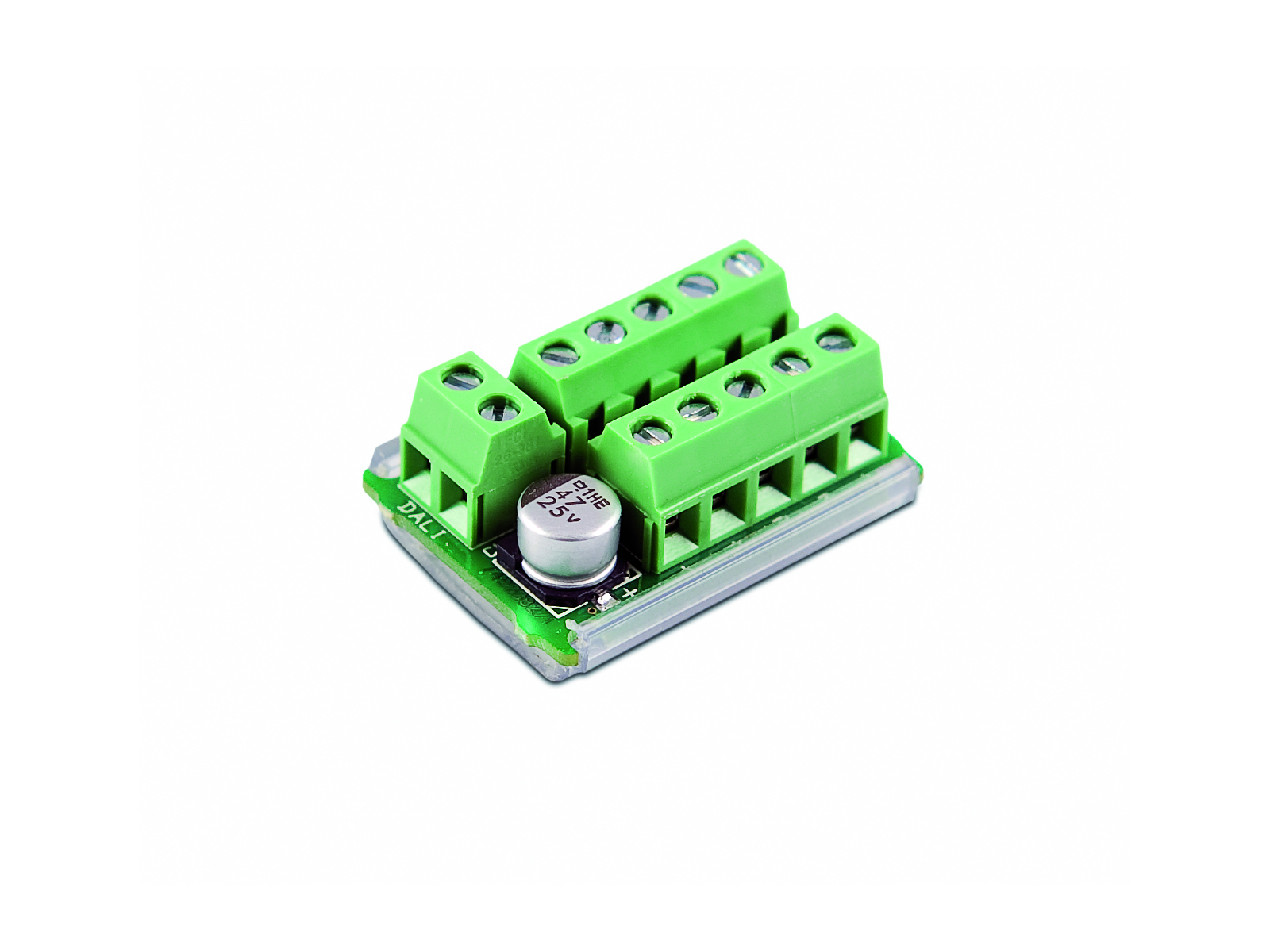 Inputmodulet har 4 indgange til brug med voltfri kontakter og fire LED-udgange til indikator LED’er. Der er ingen behov for ekstern strømforsyning, da strømmen genereres via DALI-netværket.