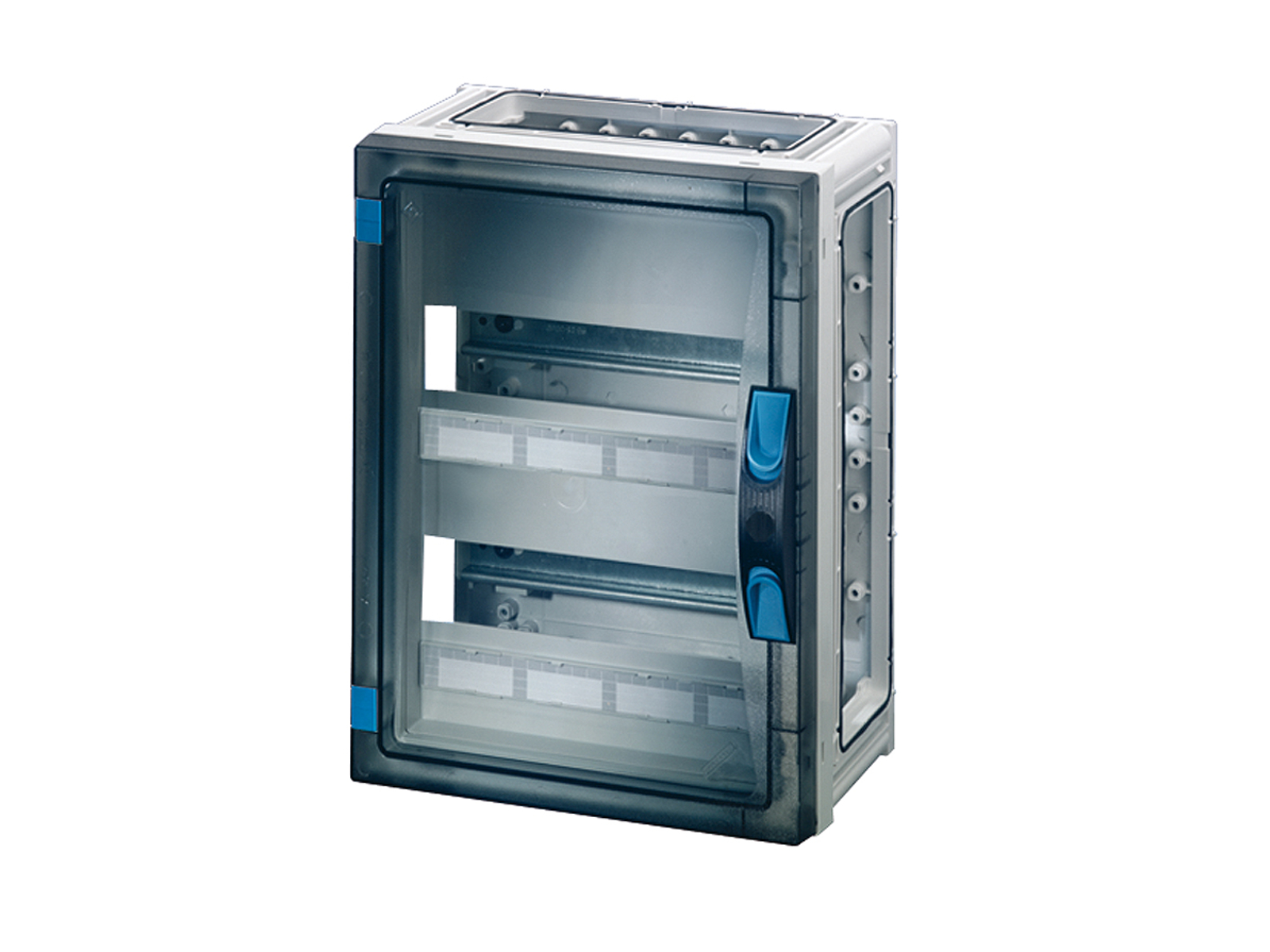 Kasse med transparent dør og uden sider. Til installation af DIN-skinne udstyr op til 100A. Kan også betjenes af ikke-fagkyndige personer.
