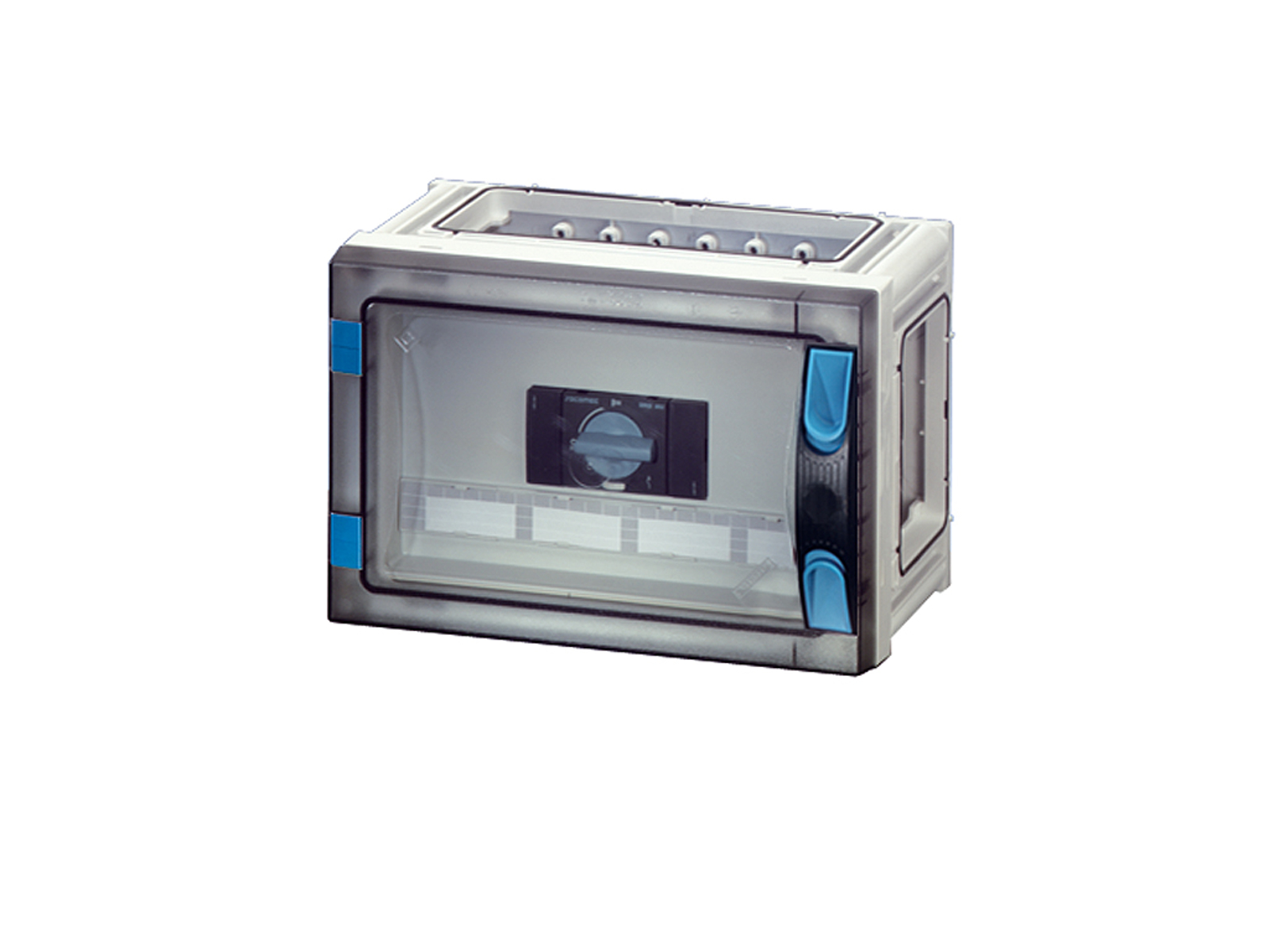 Kasse med transparent dør og uden sider. Med skillesikring med indbygget sikringsafbryder iht. IEC 60947-3. Kan også betjenes af ikke-fagkyndige personer.