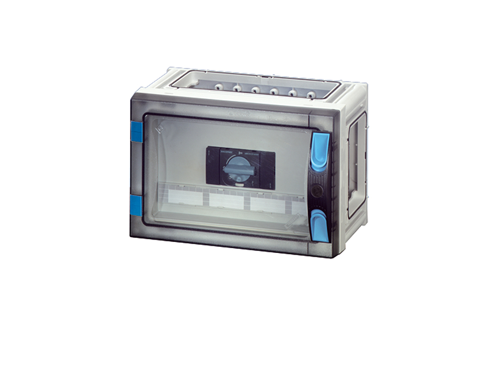 Kasse med transparent dør og uden sider. Med skillesikring med indbygget sikringsafbryder iht. IEC 60947-3. Kan også betjenes af ikke-fagkyndige personer.