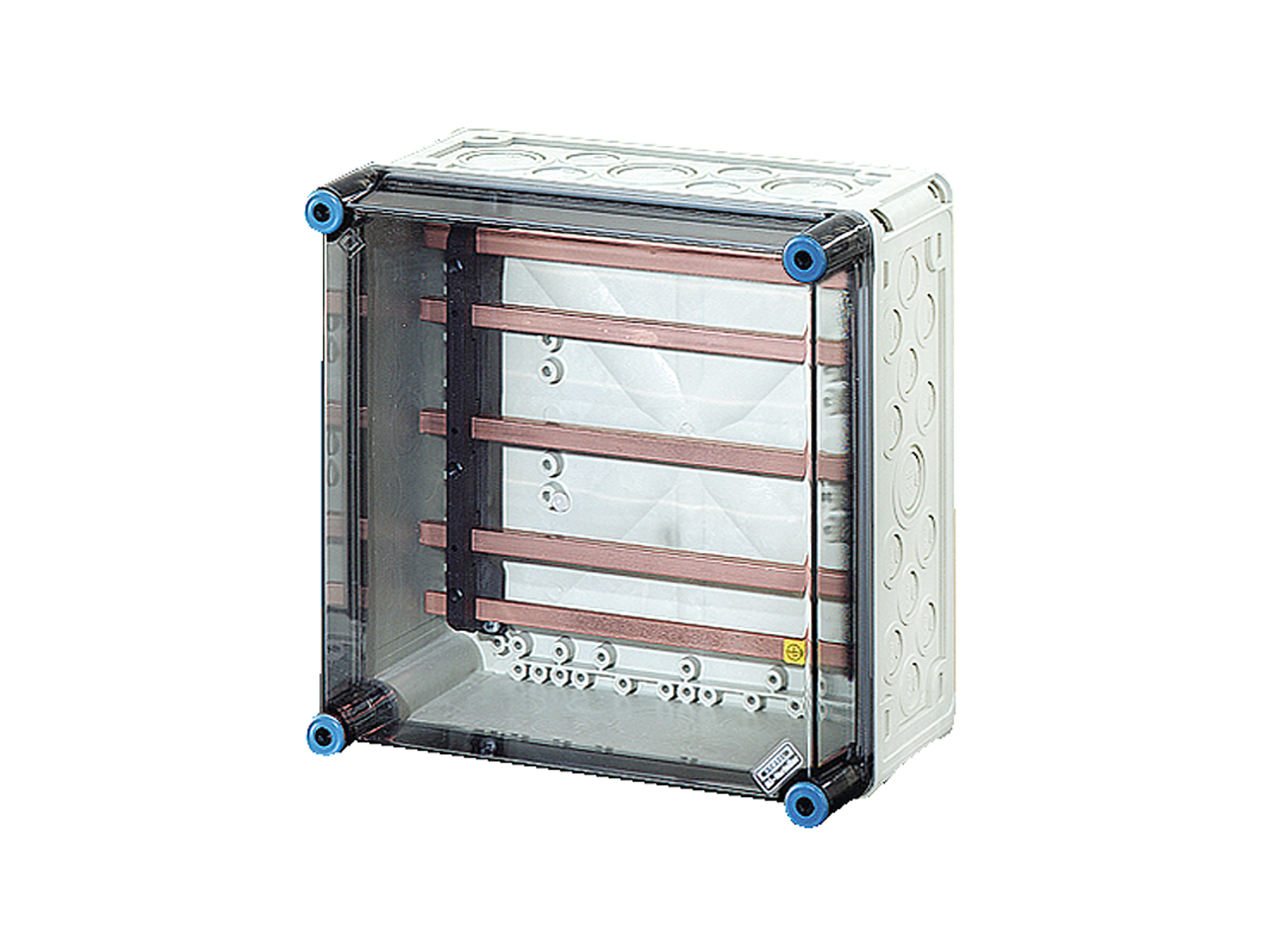 Kasse med skinnefelt. Nominel strømstyrke for skinner 250A. Mål (HxBxD) 300 x 300 x 170 mm.