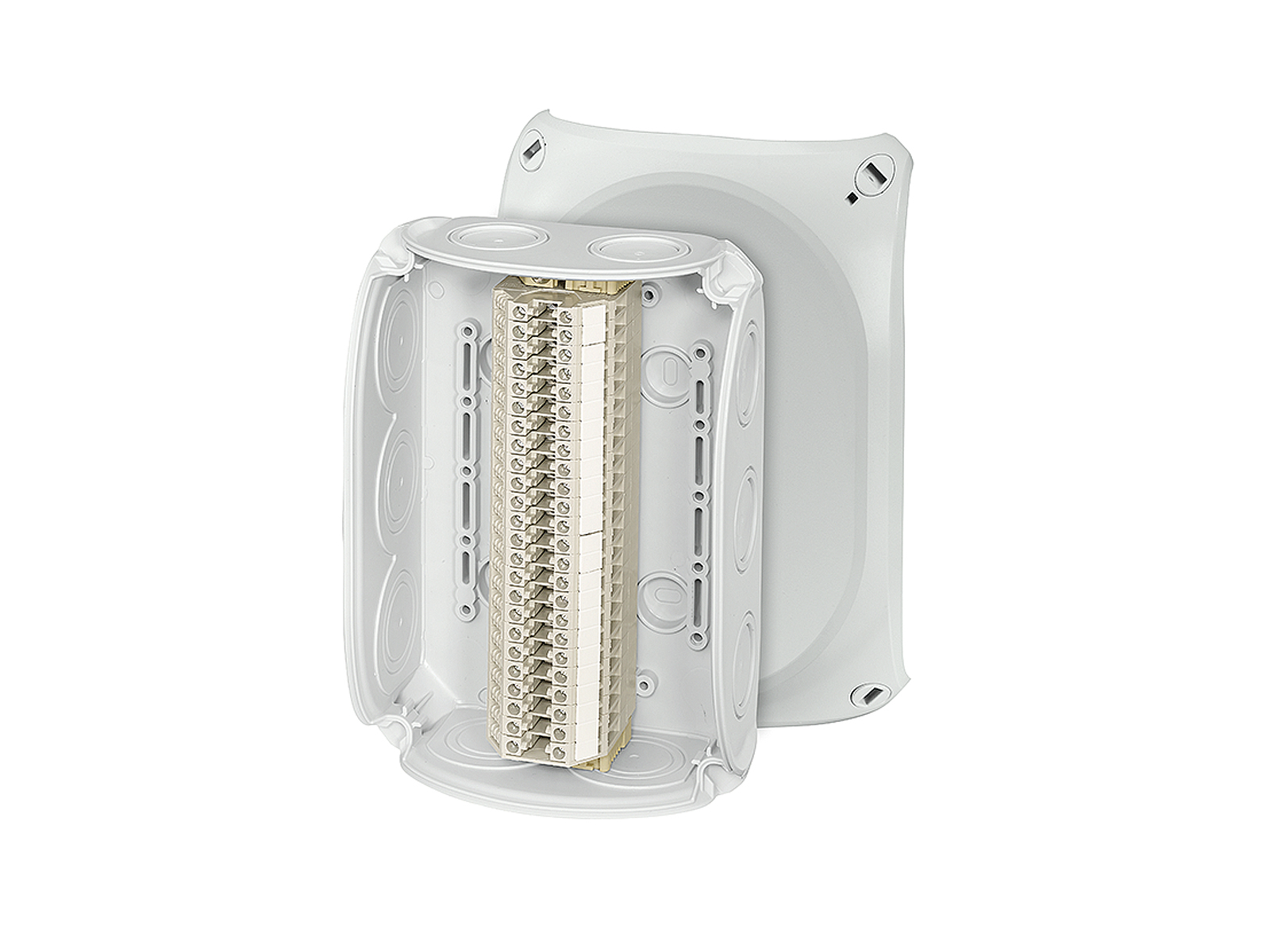Hensel forgreningsdåse med 24 x klemrækker til Cu ledere. Kabelindgang via indbyggede gummimembraner.
