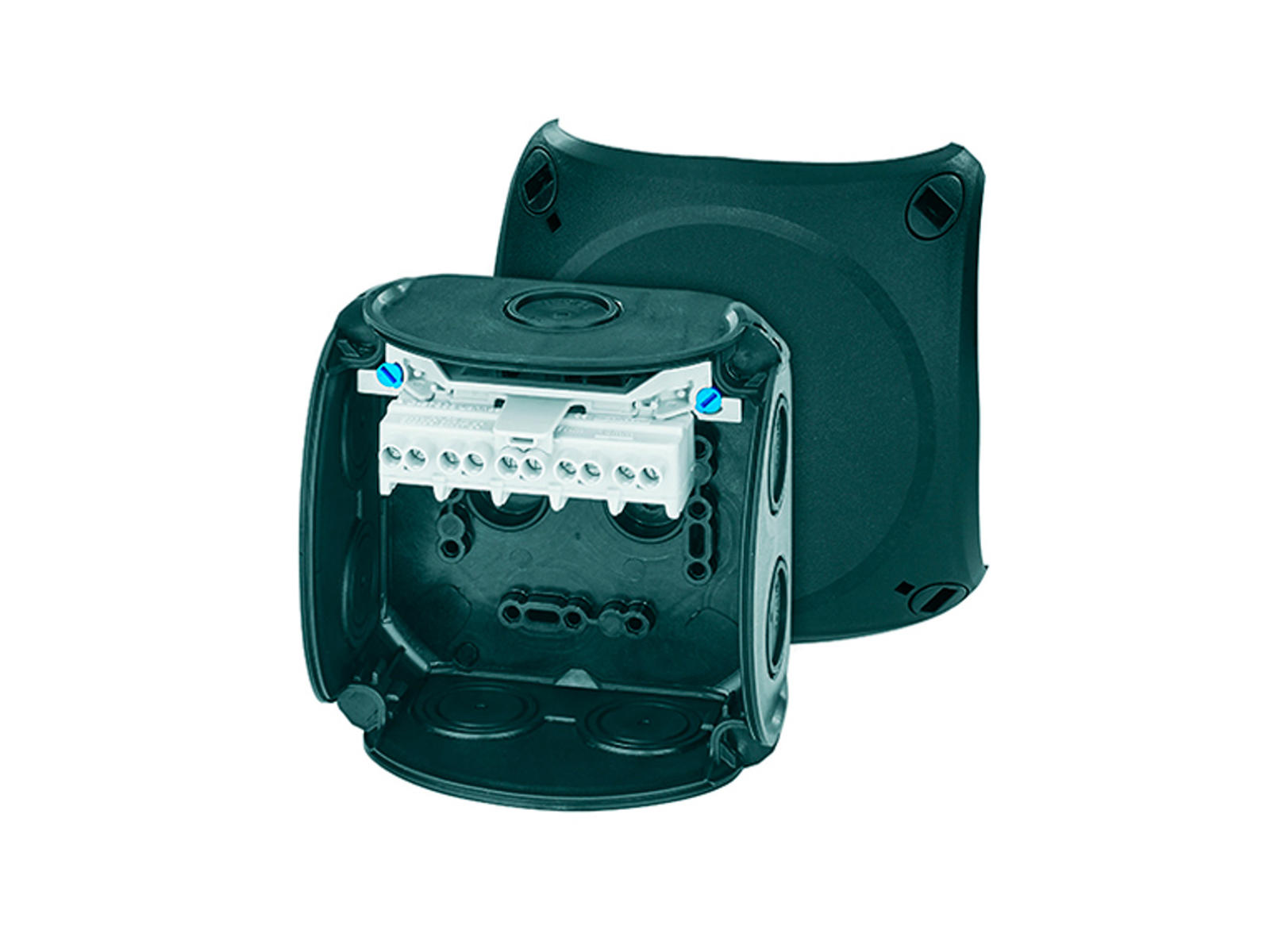 Hensel forgreningsdåse med klemme til Cu-leder, 2 terminaler per pol. Kabelindgang via indbyggede gummimembraner.