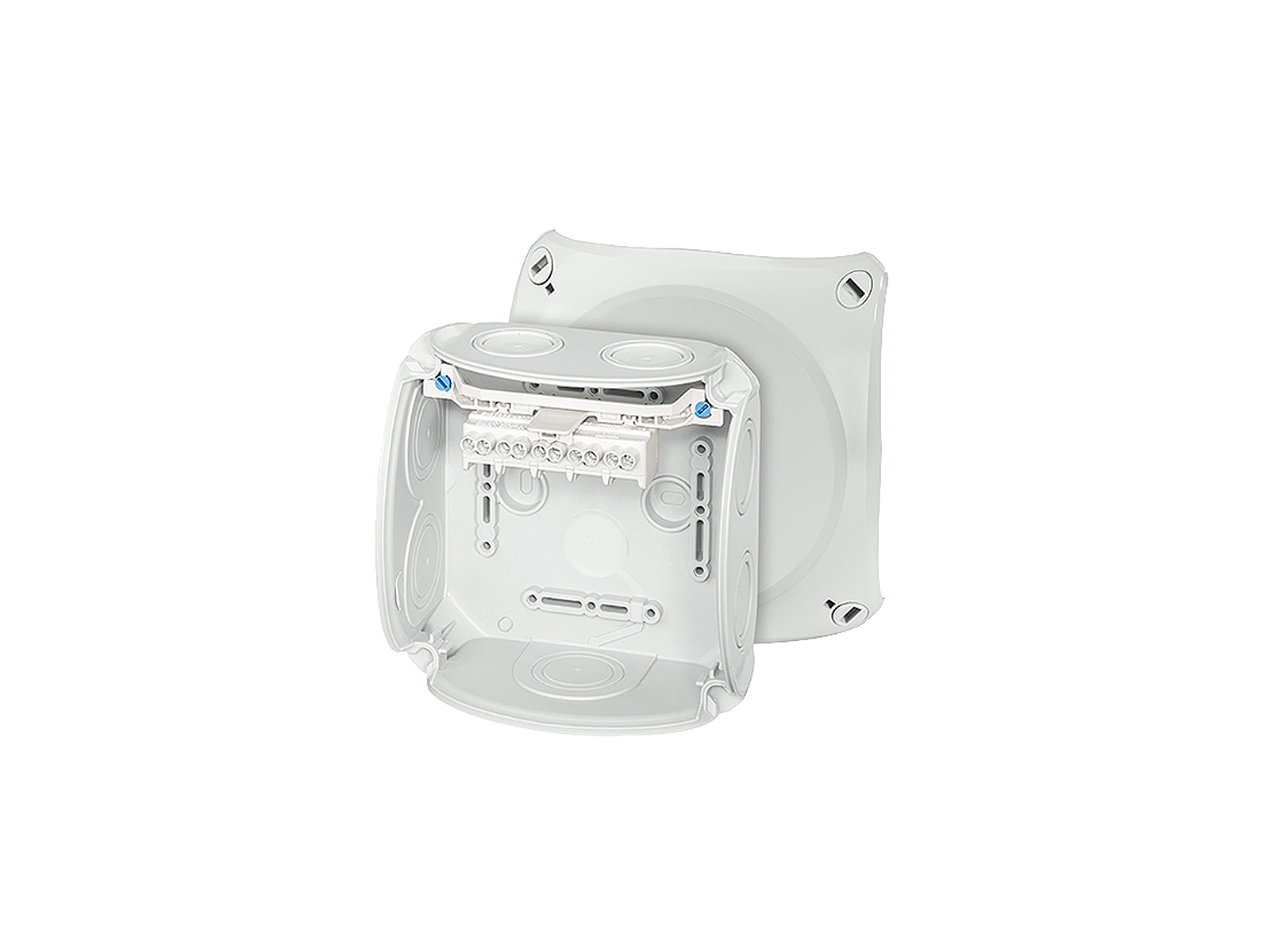 Hensel forgreningsdåse med klemme til Cu-leder, 2 terminaler per pol. Kabelindgang via indbyggede gummimembraner.