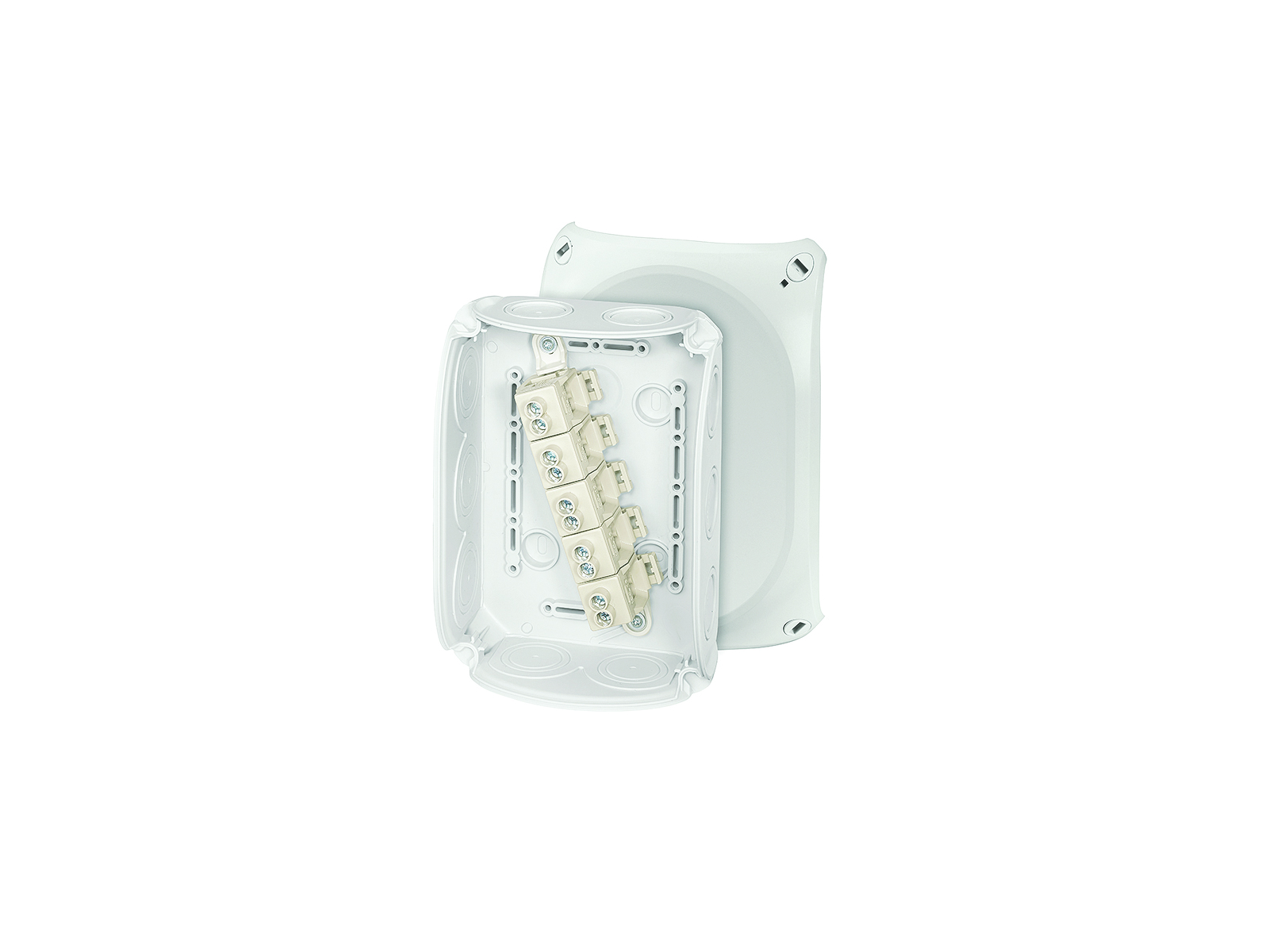 Hensel forgreningsdåse med klemme til Cu-leder, 2 terminaler per pol. Kabelindgang via indbyggede gummimembraner.