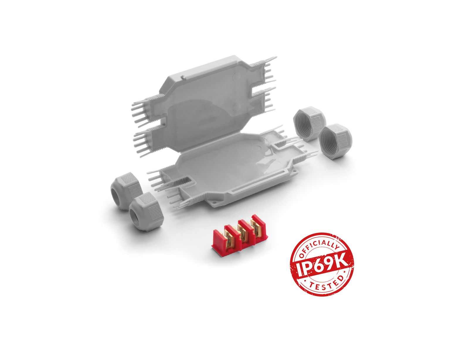 Denne samledåse med gel har mulighed for 4 kabler. IP68 og IP69K, leveres klar til brug og er ekstrem kompakt.