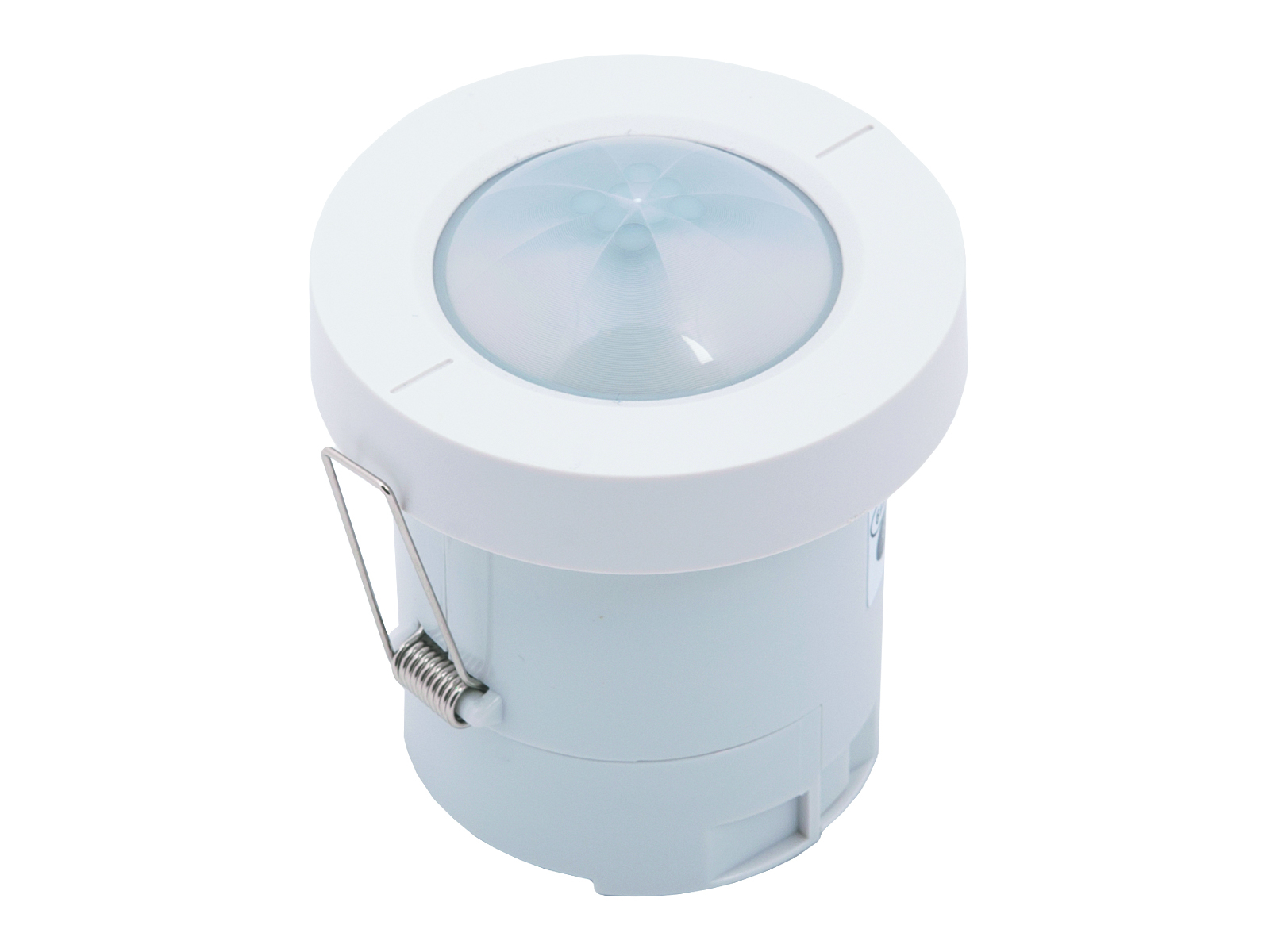 Loftmonteret PIR sensor (IP40) u/dagslys. Med en monteringshøjde på 15m detekterer sensoren 20° med en rækkevidde på 5,1m. Med en monteringshøjde på 6m detekterer sensoren 20° med en rækkevidde på 2m.
