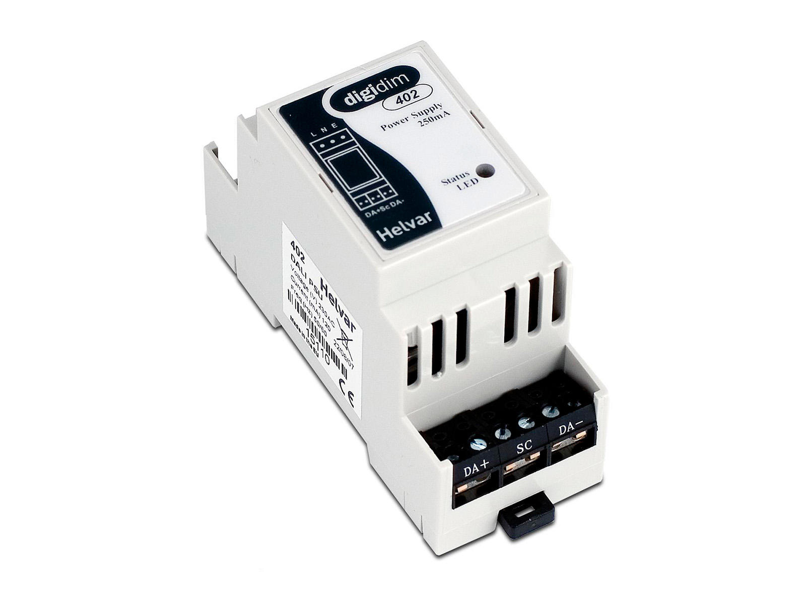 Strømforsyningen er DIN-skinnemonteret og en LED indikerer, at den er tilsluttet lysnettet.