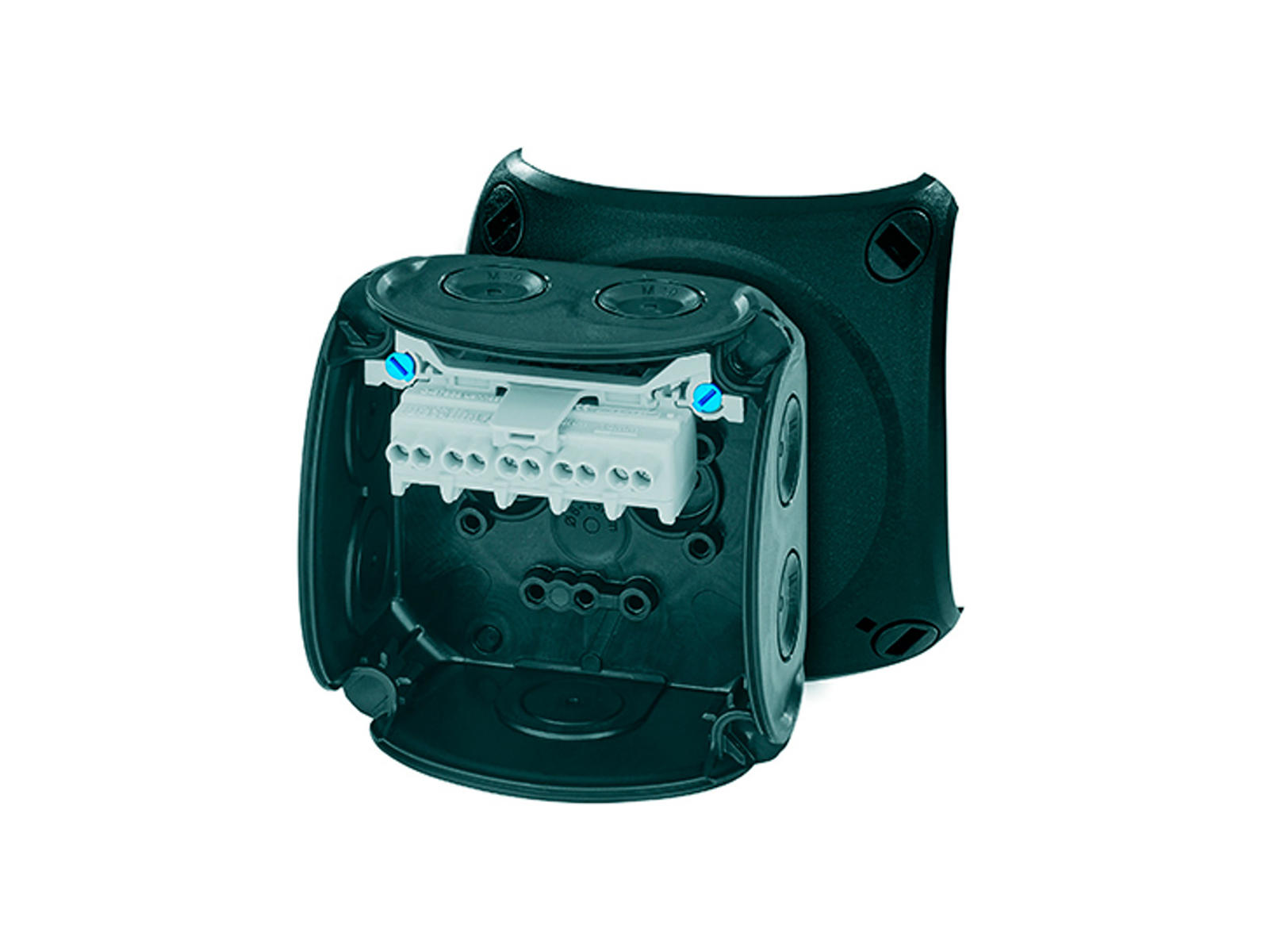 Hensel forgreningsdåse med klemme til Cu-leder, 2 terminaler per pol. Kabelindgang via indbyggede gummimembraner.