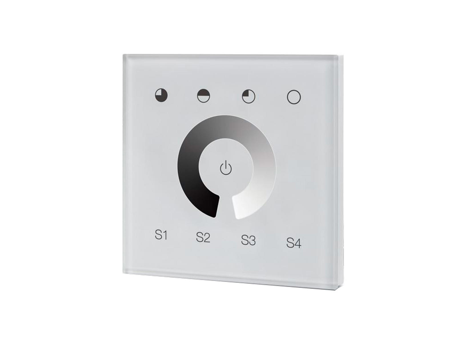 Stand-alone DALI glaspanel som gør det muligt at justere lysstyrken. Panelet kan styre 1 DALI Broadcast gruppe og 4 DALI scenarier. Startnummer for DALI adresse kan indstilles via drejeknapper på bagsiden af panelet.