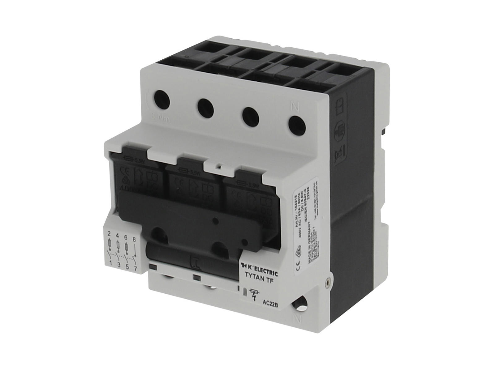 TYTAN® T gruppeafbryder fra K’ELECTRIC i 3P+N. Gruppeafbryderen kan monteres med D0 sikringer fra 2-63A eller cylindersikringer i 10x38mm fra 2-32A.