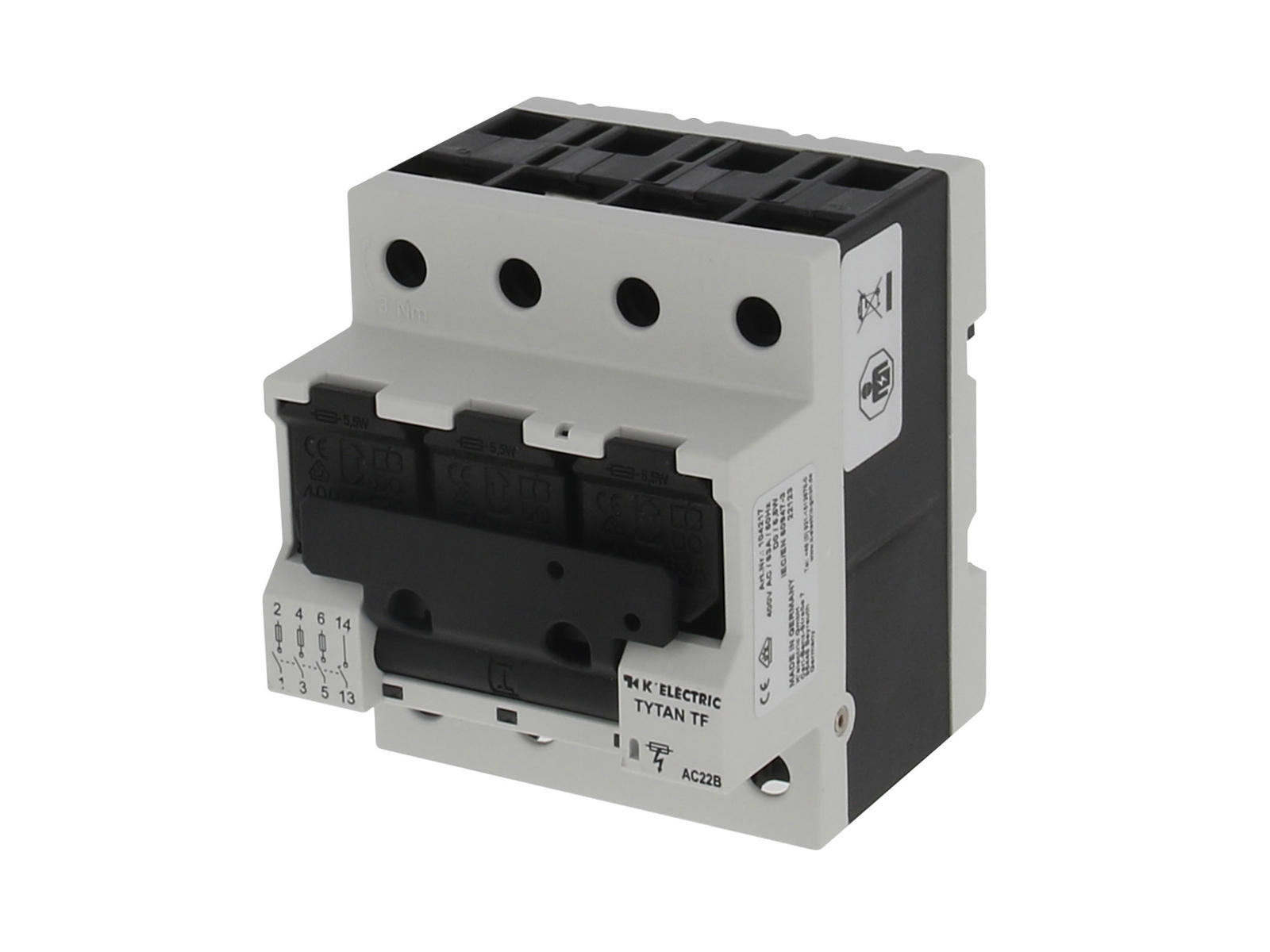 TYTAN® T gruppeafbryder med hjælpekontakt fra K’ELECTRIC i 3-pol. Gruppeafbryderen kan monteres med D0 sikringer fra 2-63A eller cylindersikringer i 10x38mm fra 2-32A.
