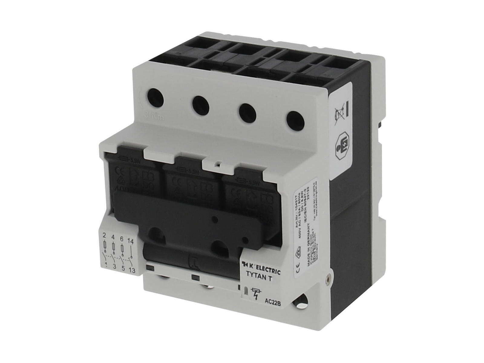 TYTAN® T sikkerhedsafbryder med hjælpekontakt fra K’ELECTRIC i 3-pol. Sikkerhedsafbryderen kan monteres med cylindersikringer i 10x38mm fra 2-32A.