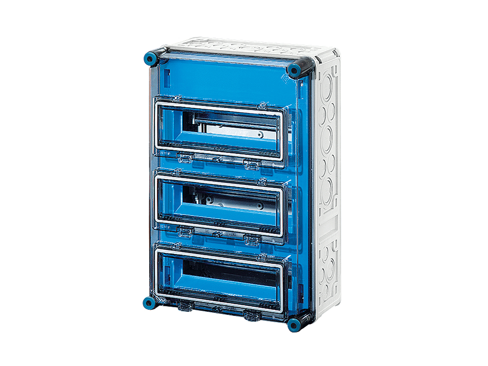 Kasse med DIN-skinne - 36 moduler (3 rækker x 12 moduler per række) med 3 stk. hængslede klaplåger. Uden PE og N klemme.