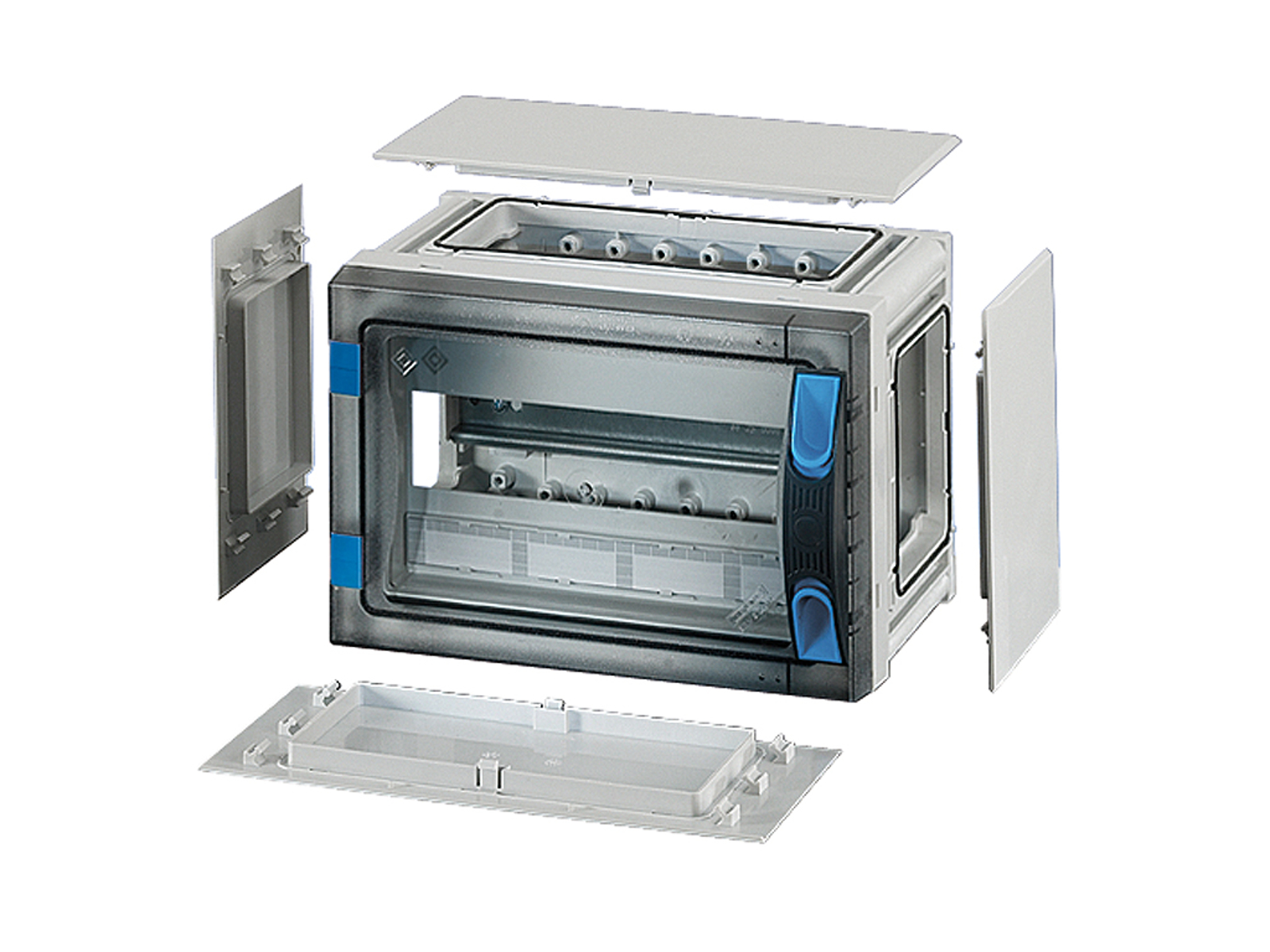 Kasse med transparent dør og sider samt aftagelig DIN-skinne og jordforbindelse. Til installation af DIN-skinne udstyr op til 63A. Kan også betjenes af ikke-fagkyndige personer.